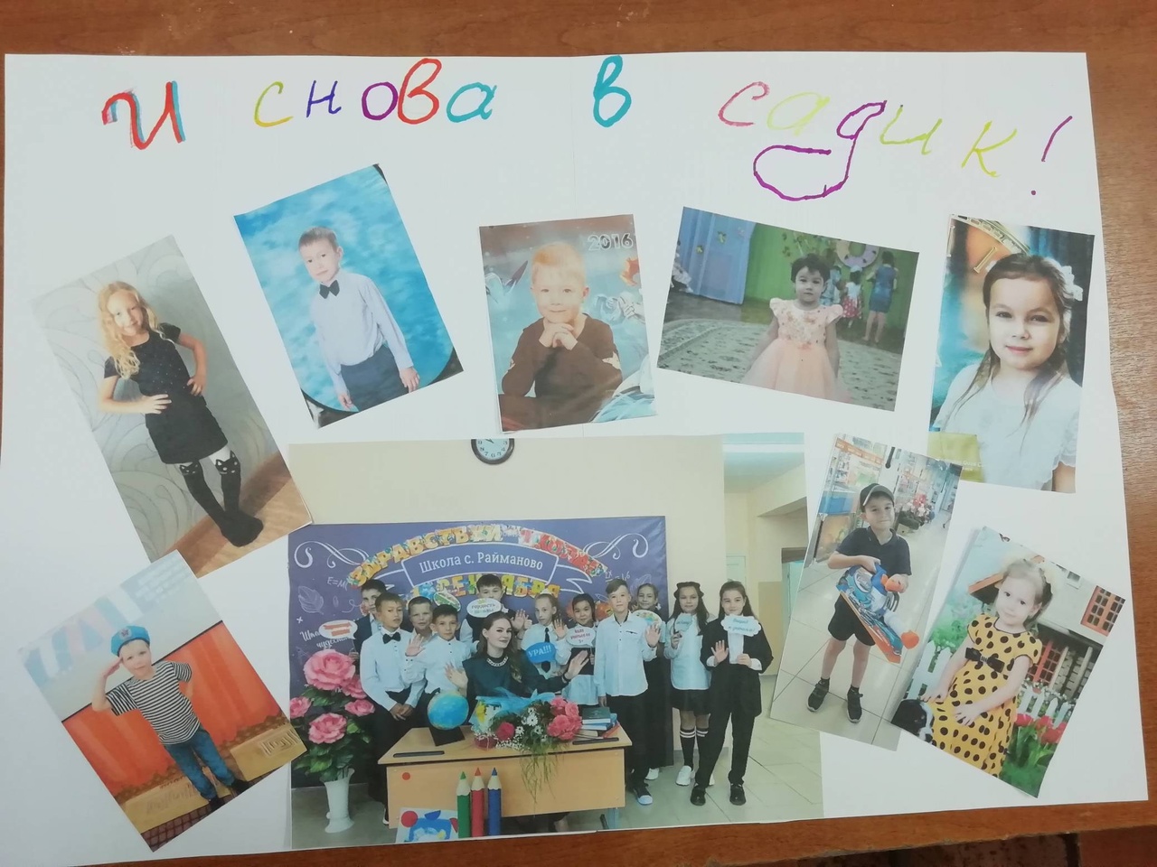 В МАОУ СОШ с.Райманово 26 сентября, в канун празднования Дня работника дошкольного образования, учащиеся 5 класса нашей школы, совместно с советником, сделали фотоколлаж "И снова в садик!", куда приклеили изображения детей в детсадовские годы и в настоящ